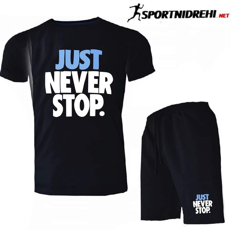Летен спортен екип JUST, черен, памук и ликра. Екипа е съставен от тениска и къси панталони. Късите панталони имат два джоба отпред с ципове. Високо качество на материя и изработка.