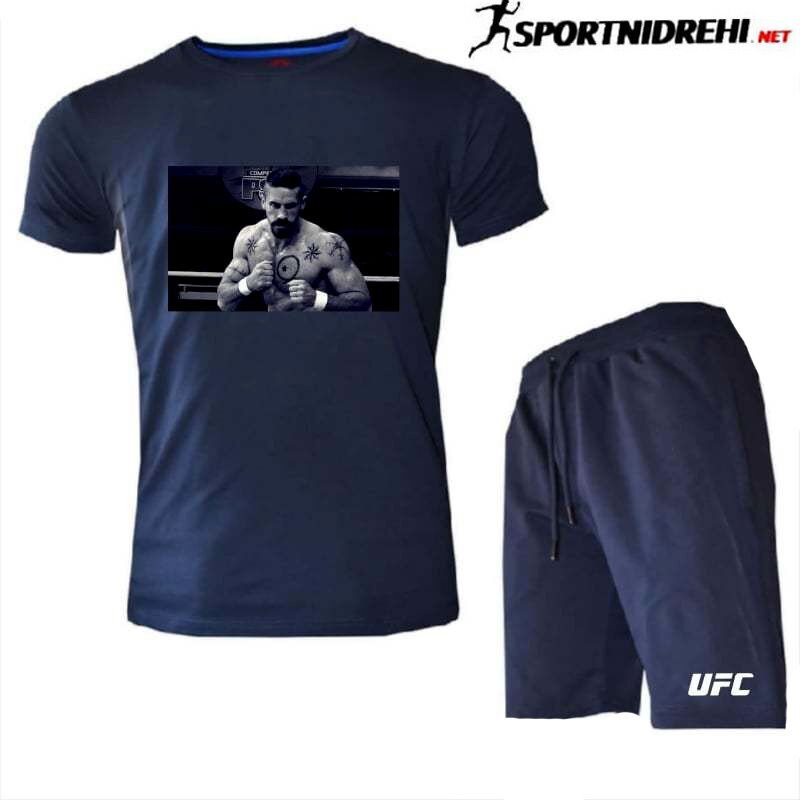 Летен спортен екип UFC YURI BOYKA, тъмносин, памук и ликра. Екипа е съставен от тениска и къси панталони. Късите панталони имат два джоба отпред с ципове. Високо качество на материя и изработка.