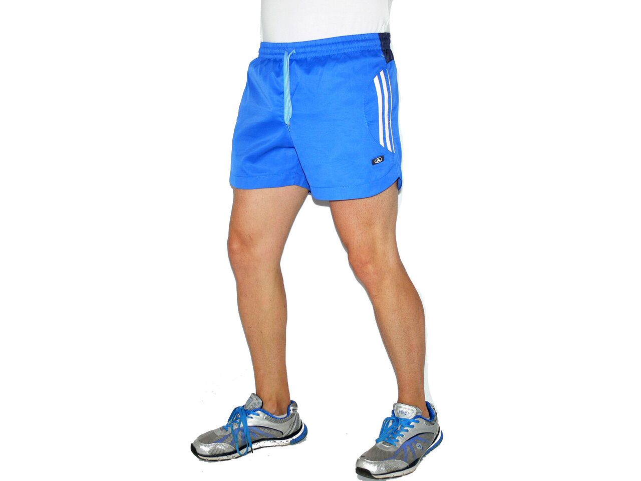 Мъжки бански RAYMOND, сини с бяло, полиестер. Произведено в България. Материята е бързосъхнещ полиестер. Банските имат мрежест бандаж, връзки за стягане и 2 джоба отпред и 1 отзад. Високо качество на материя и изработка.