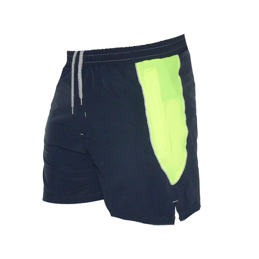 Мъжки бански REDICS, сиви с електриково зелено, полиестер. Произведено в България. Материята е бързосъхнещ полиестер. Имат мрежест бандаж, връзки за стягане и 2 джоба отпред с ципове. Високо качество на материя и изработка.