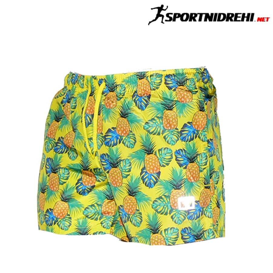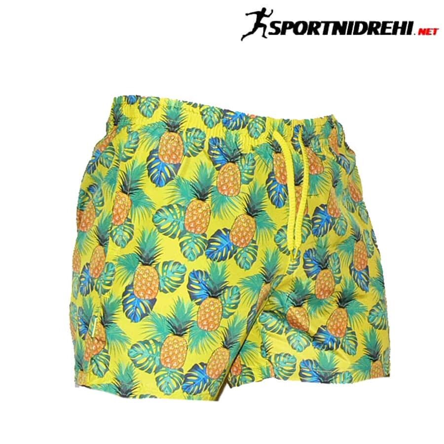 Мъжки бански REPTIL, ананаси, полиестер. Произведено в България. Материята е бързосъхнещ полиестер. Банските имат 2 джоба отпред с ципове, мрежест бандаж и връзки за стягане.