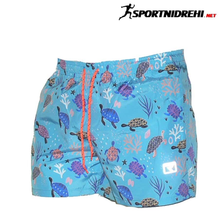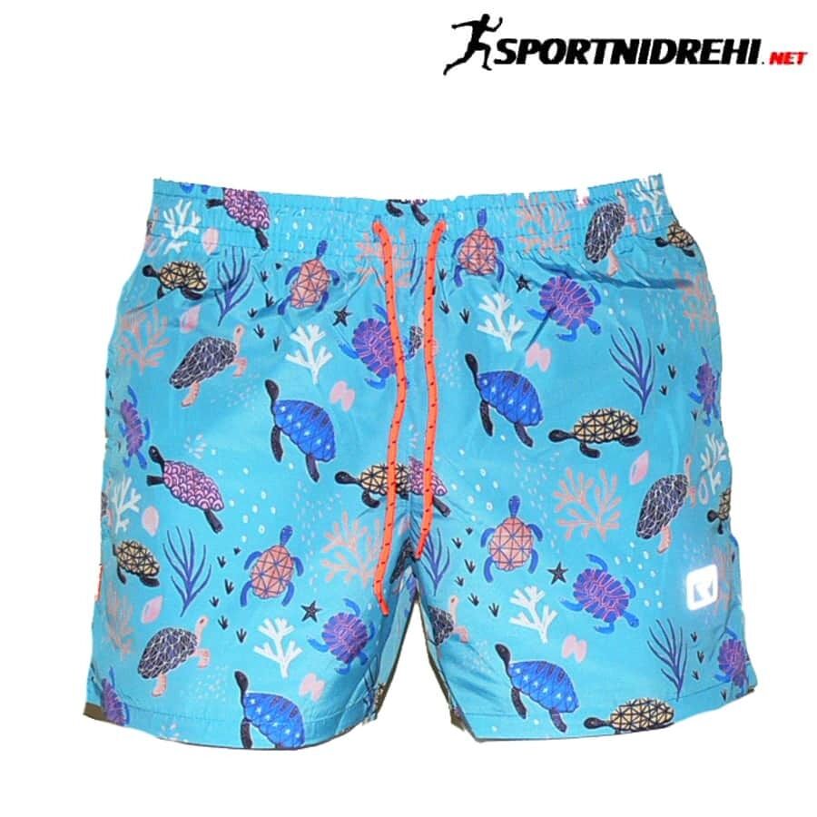Мъжки бански REPTIL, костенурки, полиестер. Произведено в България. Материята е бързосъхнещ полиестер. Банските имат 2 джоба отпред с ципове, мрежест бандаж и връзки за стягане.
