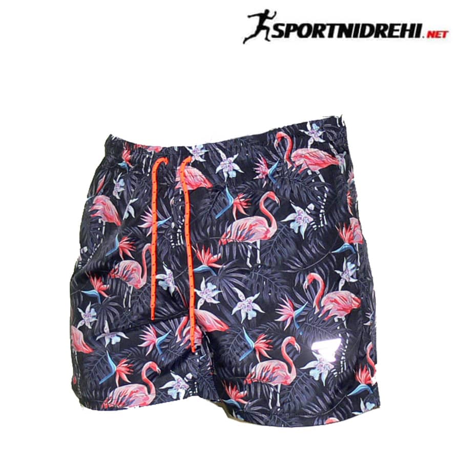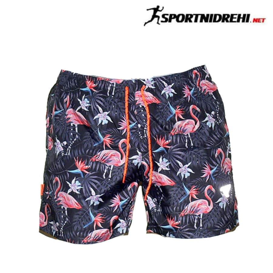 Мъжки бански  REPTIL, розово фламинго, полиестер.  Произведено в България. Материята е бързосъхнещ полиестер. Банските имат 2 джоба отпред с ципове, мрежест бандаж и връзки за стягане.