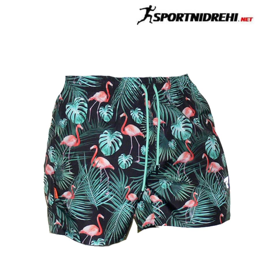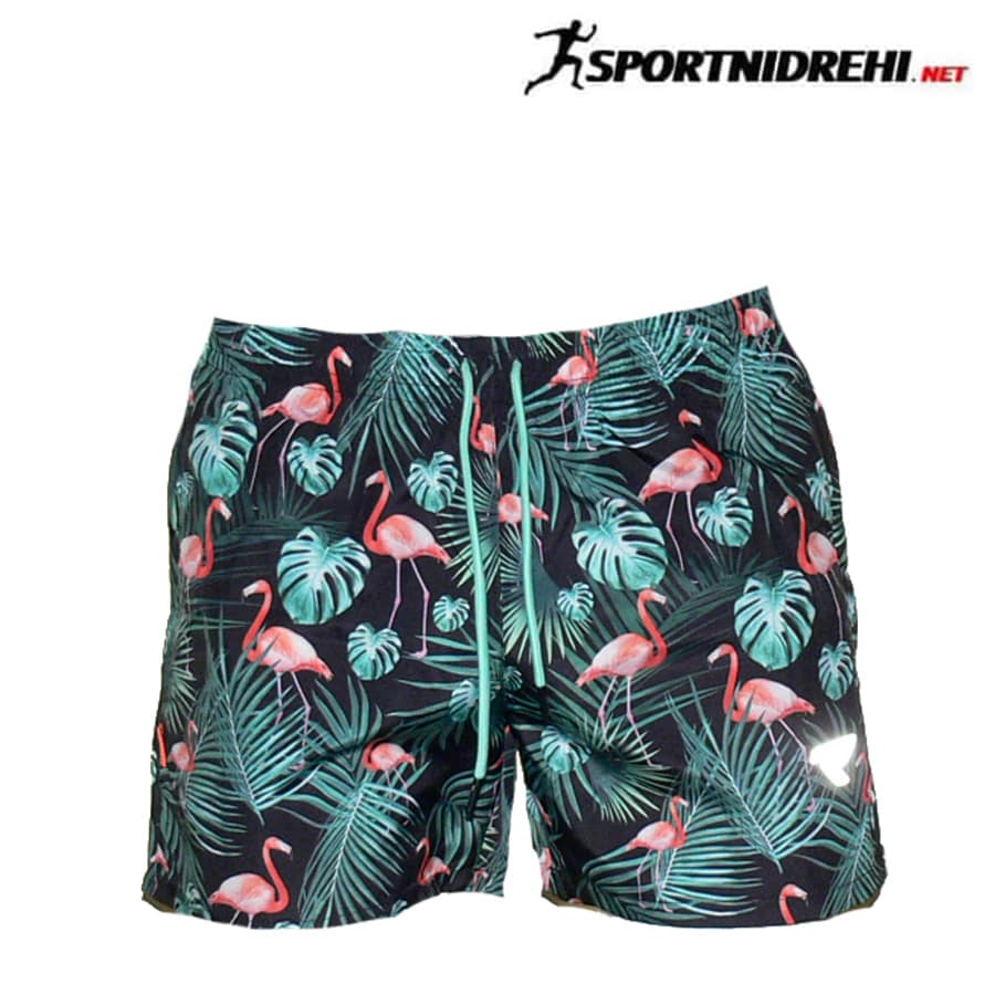 Мъжки бански REPTIL, розово фламинго, полиестер. Произведено в България. Материята е бързосъхнещ полиестер. Банските имат 2 джоба отпред с ципове, мрежест бандаж и връзки за стягане.