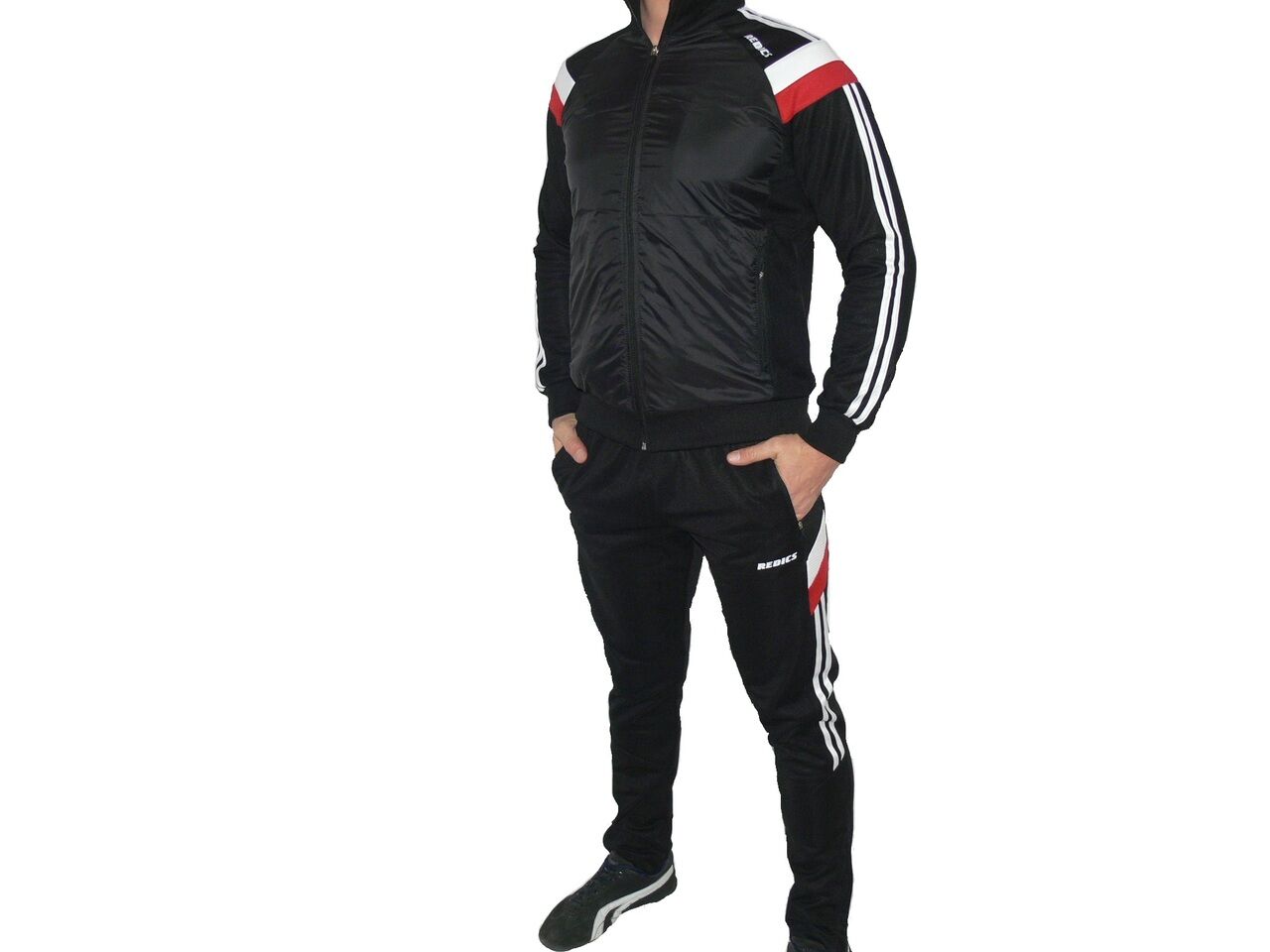 Мъжки футболен екип REDICS, черен със червено и бяло, полиестер. Произведено в България. Горнището има 2 джоба, долнището също 2 джоба. Всички джобове са със ципове. Долнището е стеснено долу на крачола и има цип. Високо качество на материя и изработка.
