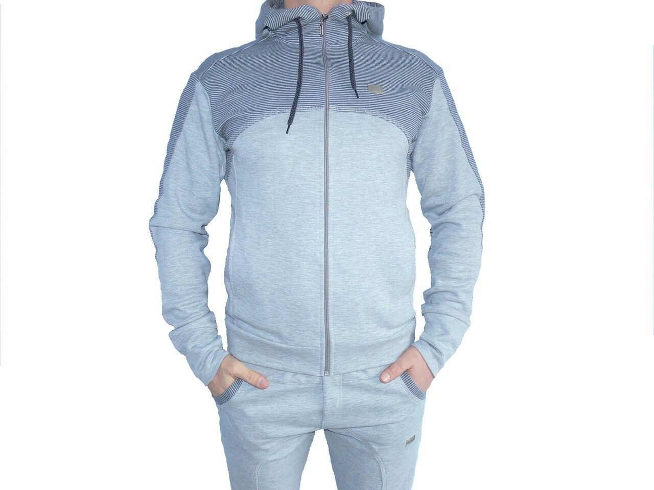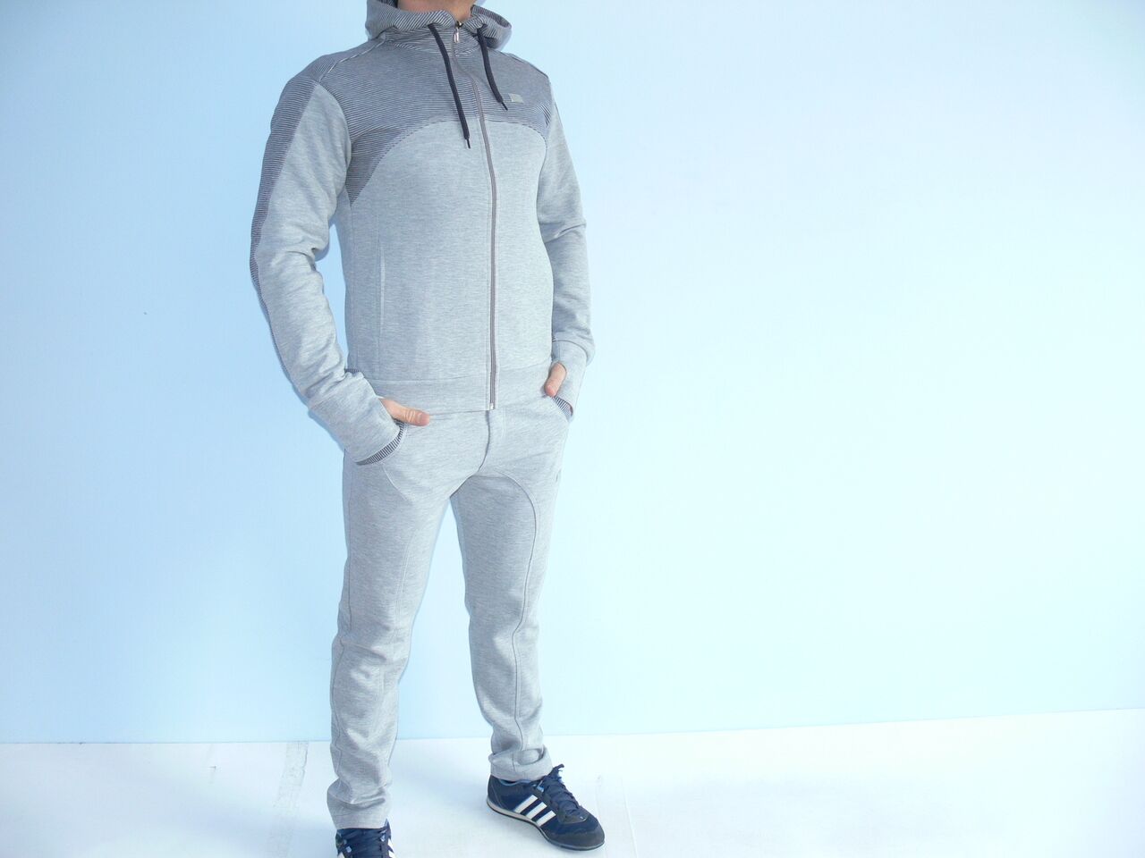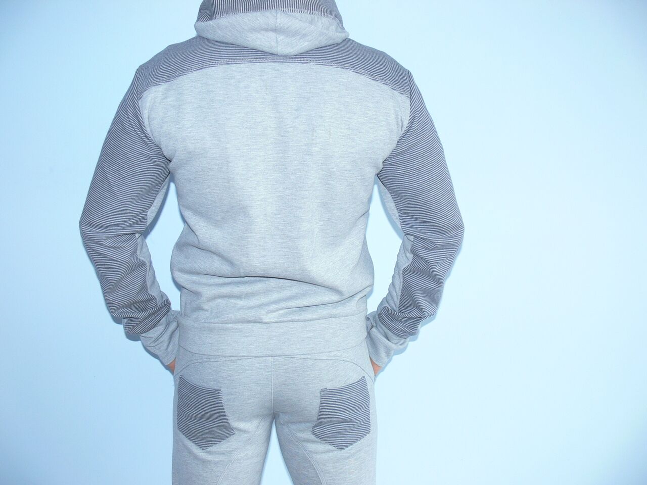 Мъжки спортен екип BRANDO, сив, памук и ликра, с качулка. Произведено в България. Горнището има 2 джоба, долнището има 2 джоба отпред и 2 отзад. Горнището има качулка. Високо качество на материя и изработка.