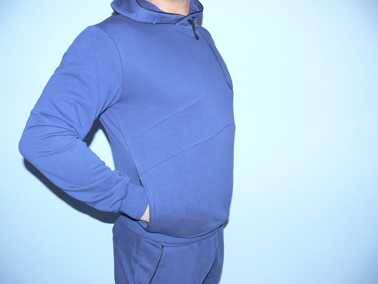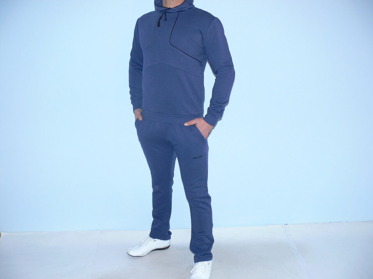 Мъжки спортен екип JUMPER, син, памук, с качулка. Произведено в България. Горнището има 2 джоба със ципове, долнището има 2 джоба отпред и един отзад. Долнището е стеснено по крака. Високо качество на материя и изработка.