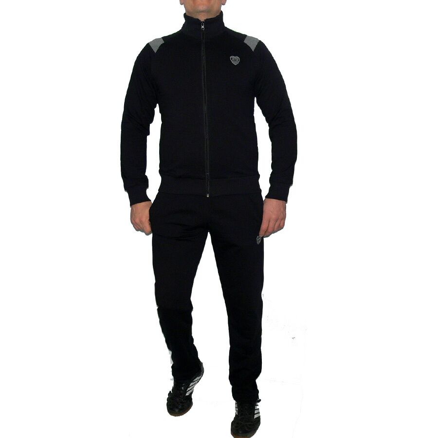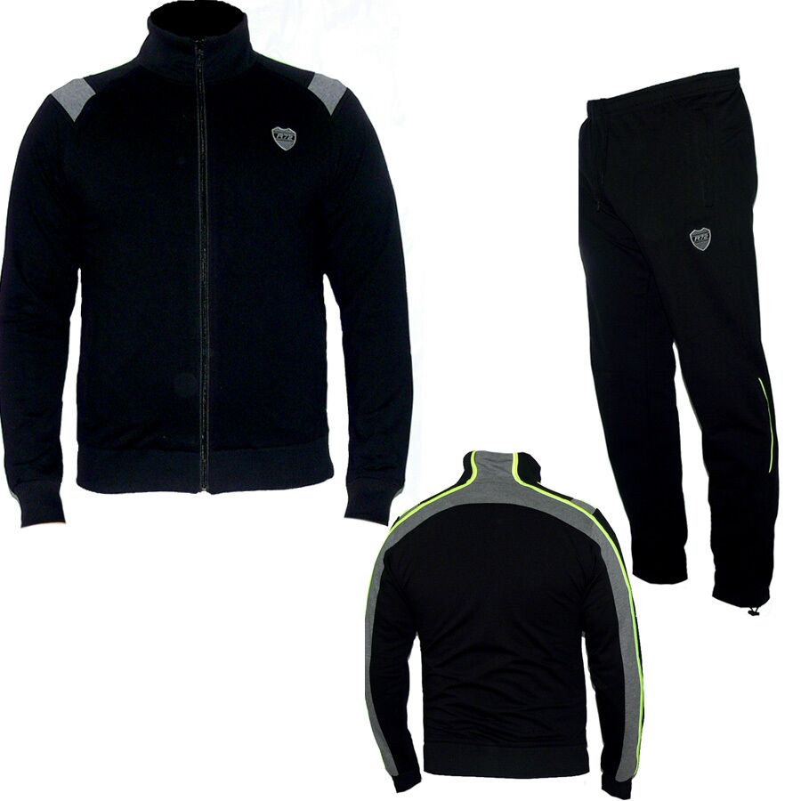 Мъжки спортен екип RAYMOND, черен със сиво и електриково зелено, памук и ликра. Произведено в България. Горнището има 2 джоба, долнището също 2 джоба. Всички джобове са със ципове. Долнището има долу на крачола ластик за стягане. Високо качество на материя и изработка.