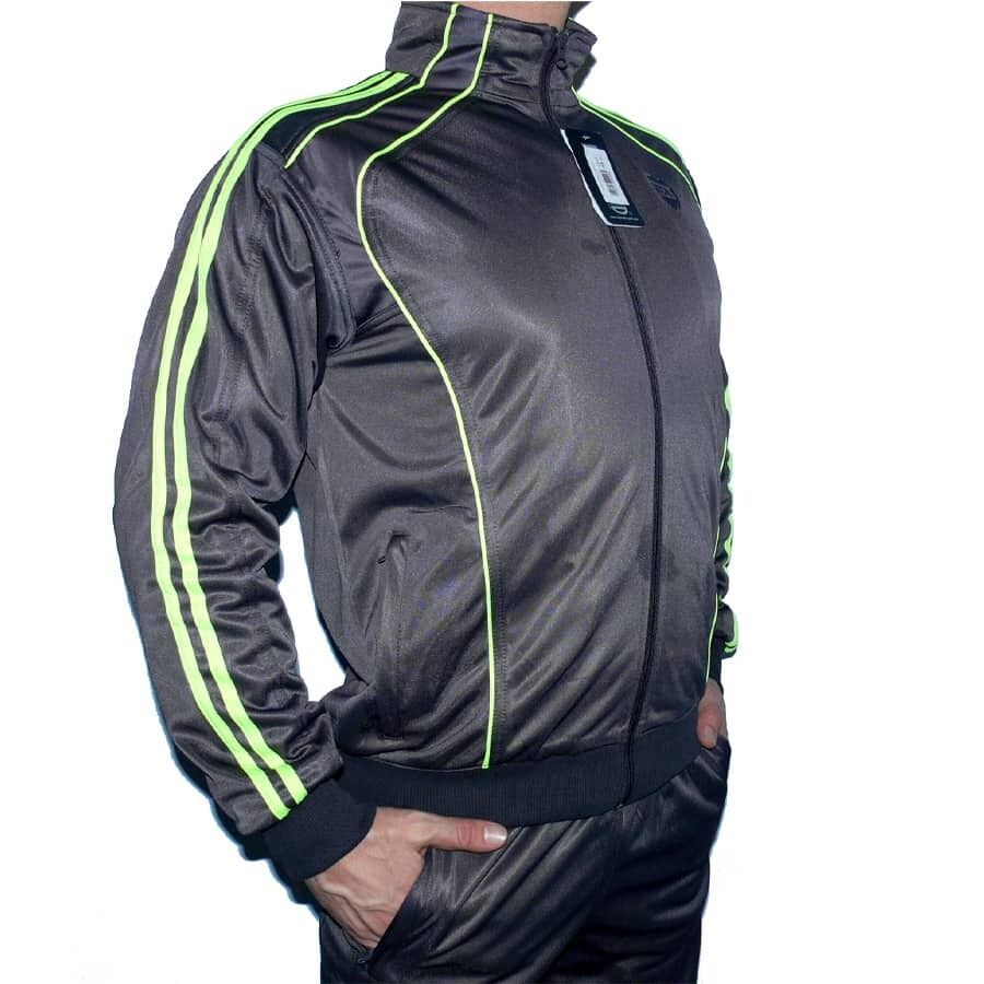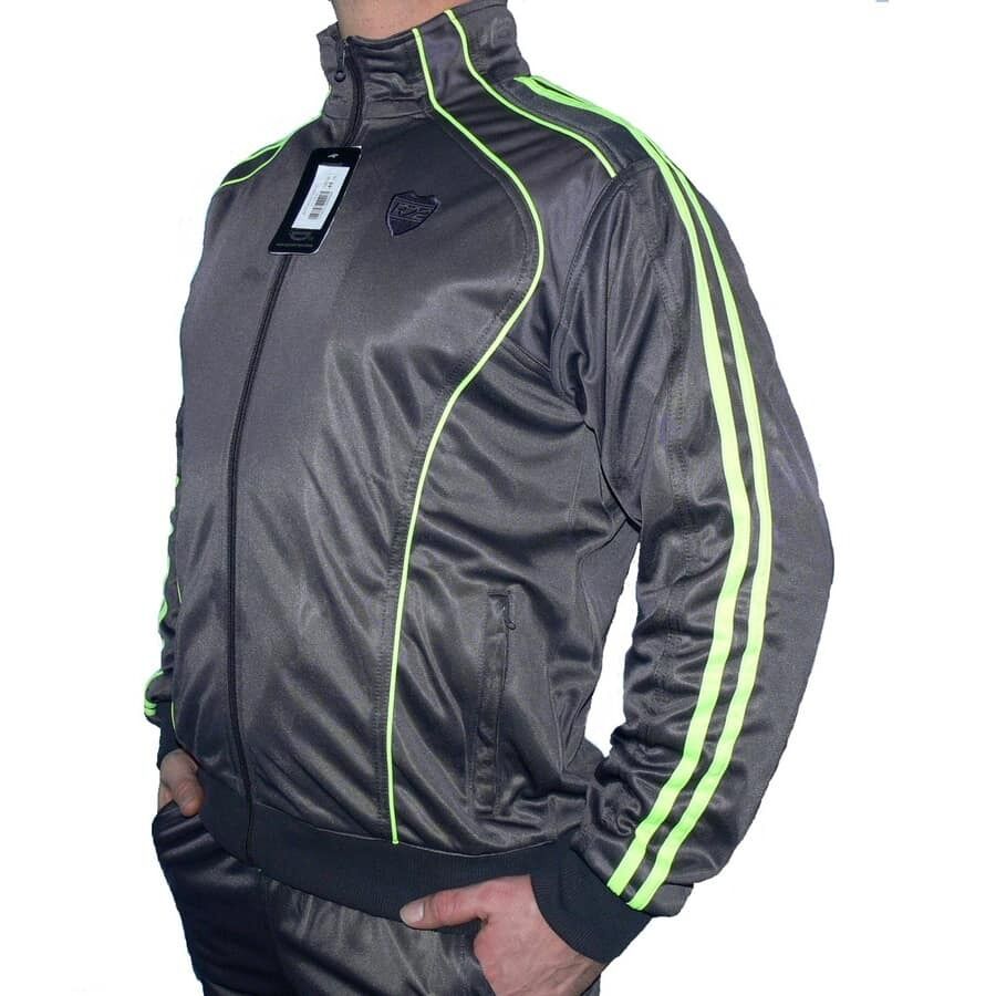Мъжки спортен екип RAYMOND, графит с електриково зелено, полиестер. Произведено в България. Горнището има 2 джоба, долнището също има 2 джоба. Всички джобове са със ципове. Долнището е с прав крачол. Високо качество на материя и изработка.