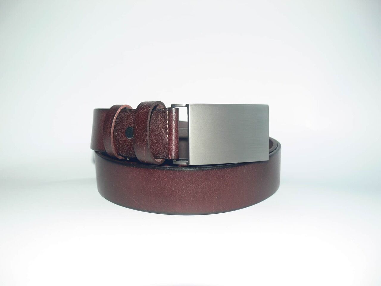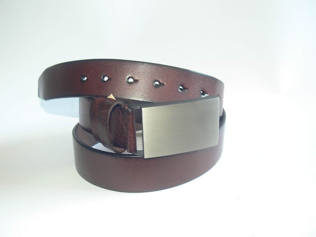 Мъжки спортен колан, кафяв, естествена кожа. Катарамата е масивна метална плочка. Дължината на колана е от 115 см. до 130 см, ширината е 3,7 см. Подходящ за дънки или спортни панталони.