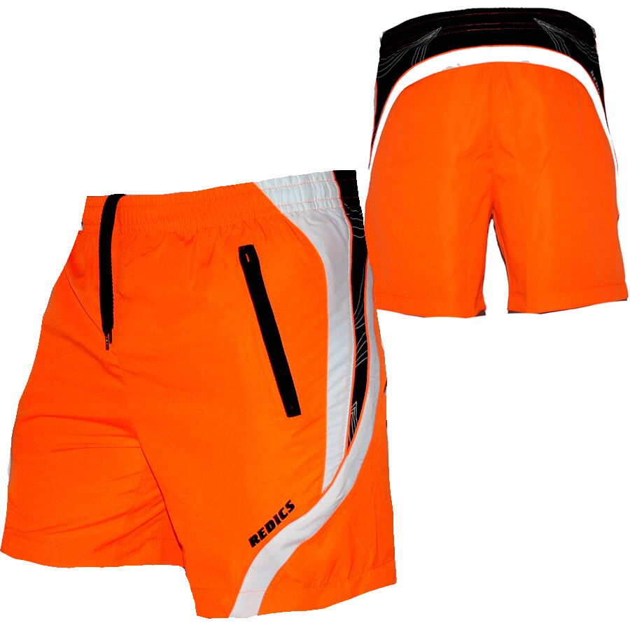 Мъжки спортни шорти REDICS, оранжеви с черно и бяло, полиестер. Произведено в България. Материята е бързосъхнещ полиестер. Шортите имат мрежест бандаж, връзки за стягане и 2 джоба отпред с ципове. Високо качество на материя и изработка.