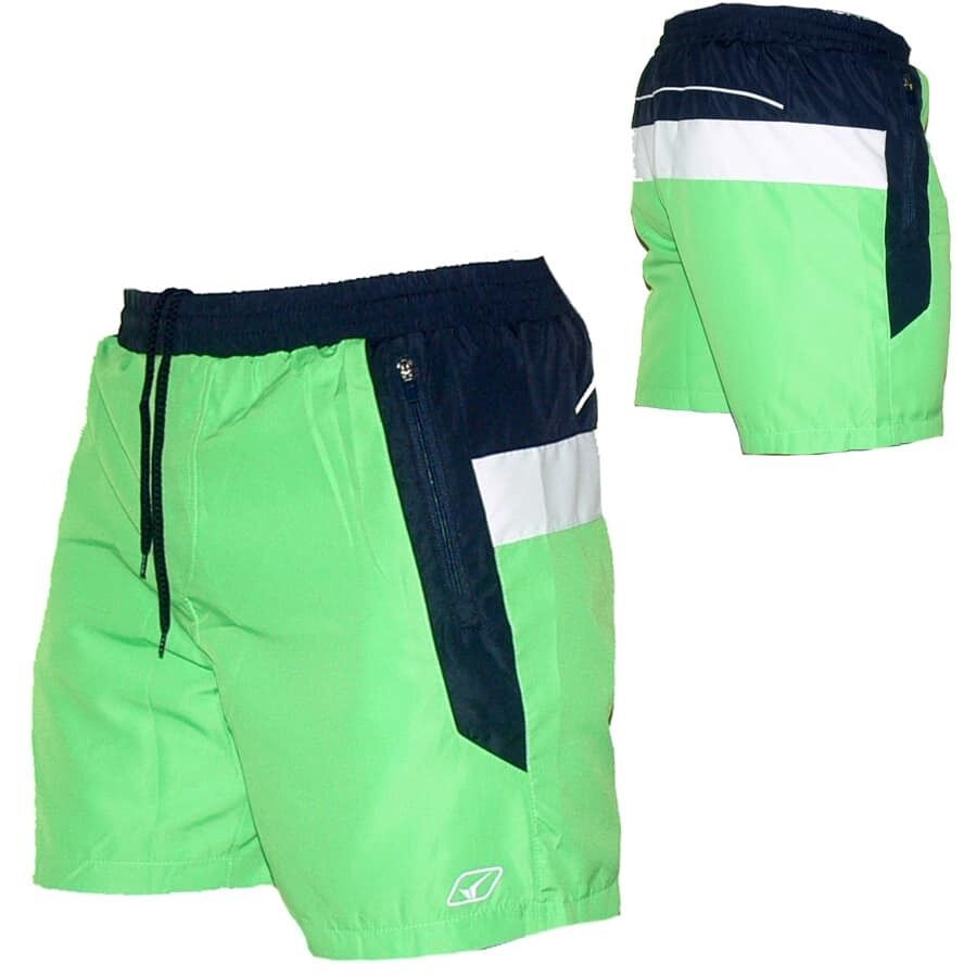 Мъжки спортни шорти REDICS, зелени, полиестер. Произведено в България. Материята е бързосъхнещ полиестер. Шортите имат мрежест бандаж, връзки за стягане и 2 джоба отпред с ципове. Високо качество на материя и изработка.