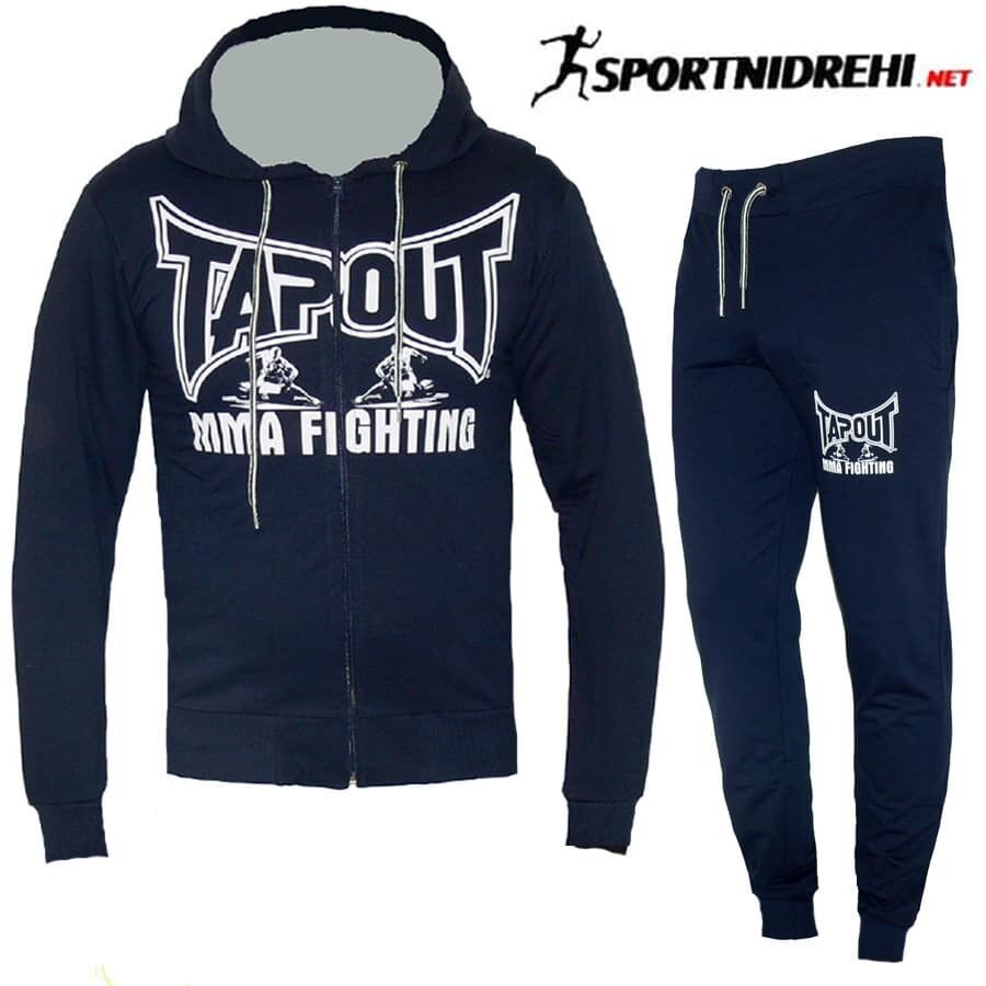 Спортен екип TAPOUT MMA, тъмно син, памук и ликра, с качулка. Горнището има 2 джоба, долнището има 2 джоба отпред и 1 отзад. Долнището е стеснено долу на крачола с широк ластик. Горнището има качулка.