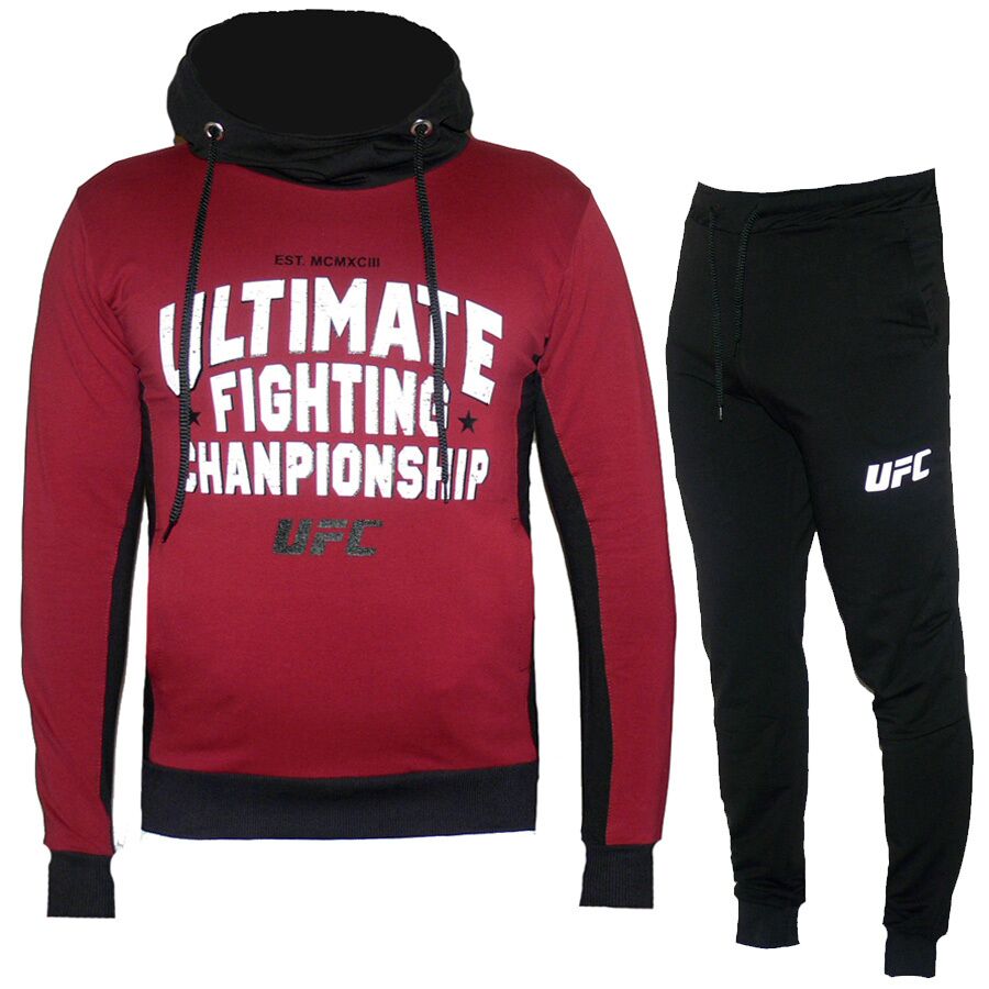 Спортен екип UFC, бордо с черно, памук и ликра, с качулка. Горнището има 2 джоба, долнището има 2 джоба отпред и 2 отзад. Долнището е стеснено долу на крачола с широк ластик. Горнището има качулка.