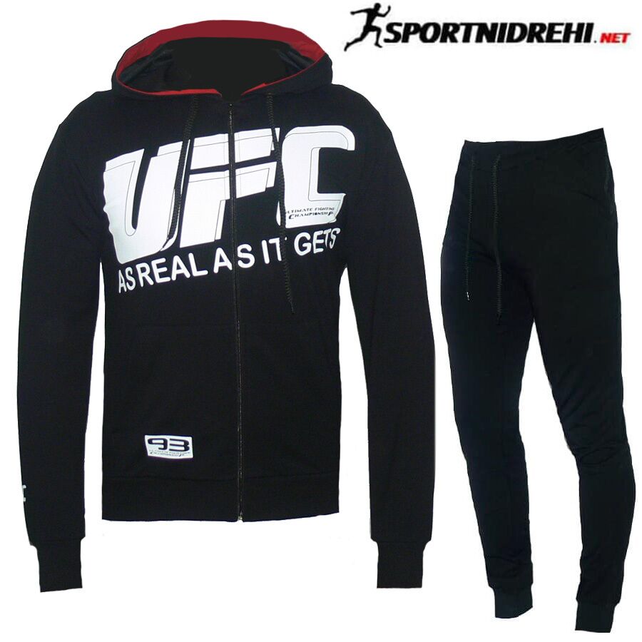 Спортен екип UFC, черен, памук и ликра, с качулка. Анцуга е подходящ за пролетно-есенния сезон. Горнището има 2 джоба, долнището има 2 джоба отпред и 2 отзад. Долнището е стеснено долу на крачола с широк ластик. Горнището има качулка.