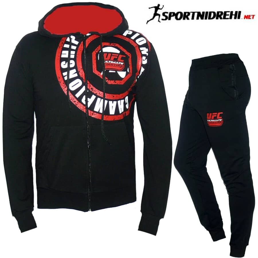 Спортен екип UFC, черен, памук и ликра, с качулка. Анцуга е подходящ за пролетно-есенния сезон. Горнището има 2 джоба, долнището има 2 джоба отпред и 2 отзад. Долнището е стеснено долу на крачола с широк ластик. Горнището има качулка.