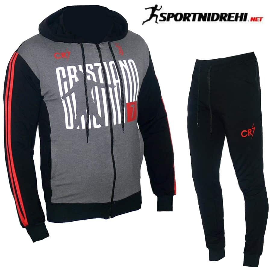 Спортен екип CRISTIANO CR7, черен с червено, памук и ликра, с качулка. Горнището има 2 джоба, долнището има 2 джоба отпред с ципове и 1 отзад без цип. Долнището е стеснено долу на крачола с широк ластик. Горнището има качулка.