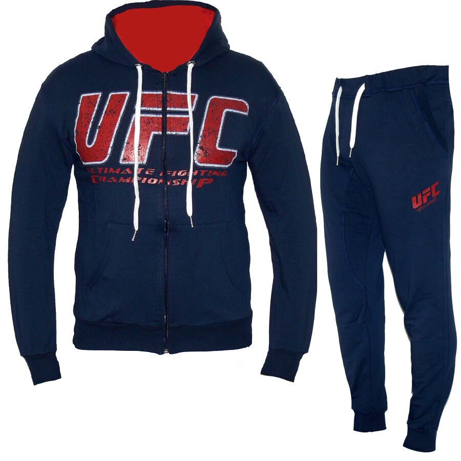 Спортен екип UFC, тъмно син с червено, памук и ликра, с качулка. Горнището има 2 джоба, долнището има 2 джоба отпред и 2 отзад. Долнището е стеснено долу на крачола с широк ластик. Горнището има качулка.